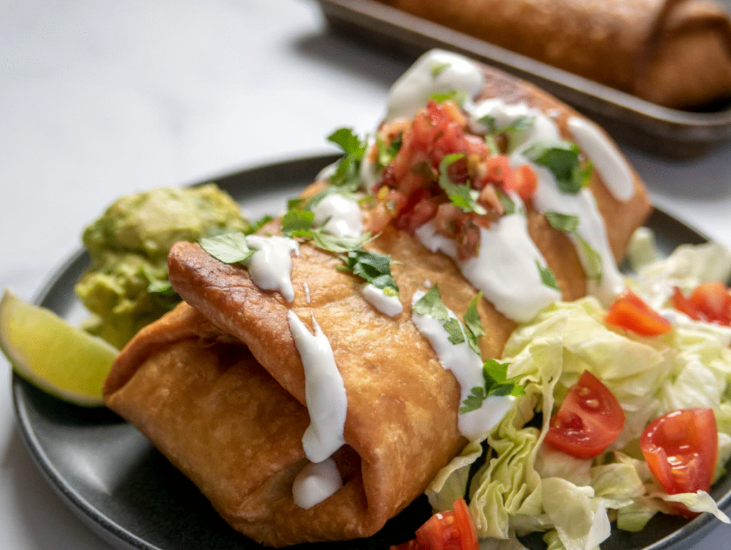 Chimichangas are deep-fried burritos. Typically, they are filled with beef and beans, as well as cheese and other ingredients like onions and peppers. They may also be served with a variety of sauces for added flavor. The burrito is dipped in a light batter before it is fried, giving the meal an extra crunch that many people enjoy.