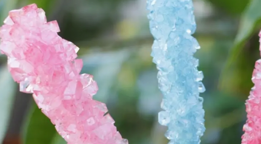 Rock candy is a type of sugar candy that is made by allowing a supersaturated solution of sugar and water to evaporate and recrystallize on a string or stick. Rock candy can also be made by heating sugar and water together until the sugar has dissolved, then cooling the mixture until crystals form.