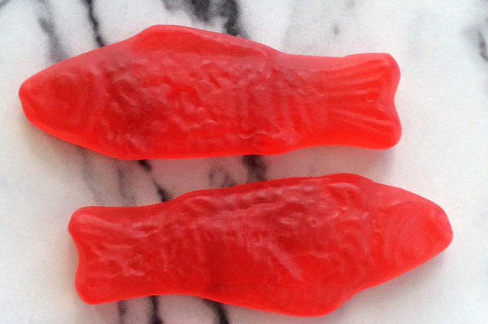 Soft and chewy gummy candy in the shape of fish that comes in a variety of flavors like cherry, orange, lemon and raspberry.