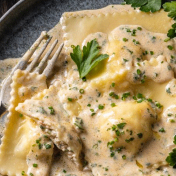 As for the cream sauce, you could make your own from scratch or buy a jar of high-quality Alfredo sauce. Either way, you’ll want to make sure the sauce is nice and thick so it doesn’t run all over the place when you spoon it over the ravioli.